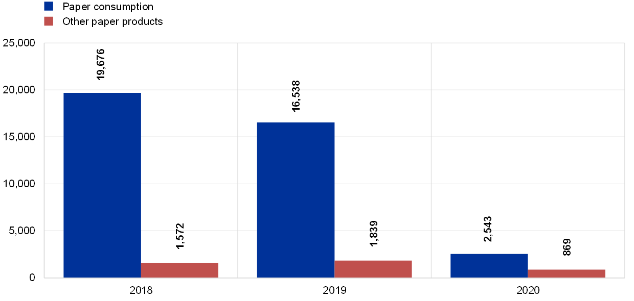 The default remote working conditions in 2020 further supported the digitalisation of processes across the ECB. Office paper consumption has been steadily declining since 2017, but fell by 84.6% in 2020 compared with the previous year. While this fall was largely related to the limited on-site presence in 2020, various measures have been implemented that are likely to sustain reduced paper consumption beyond the COVID-19 pandemic. For example, the ECB has implemented e-tendering and electronic signatures as well as further digital collaboration tools that support paperless collaboration. Moreover, the ECB has reduced the environmental footprint of its paper consumption by using recycled paper, which now accounts for 98.3% of all the paper it consumes.