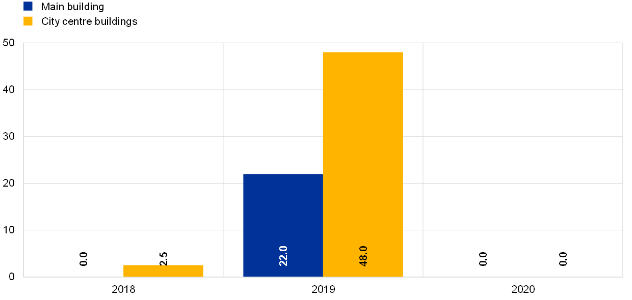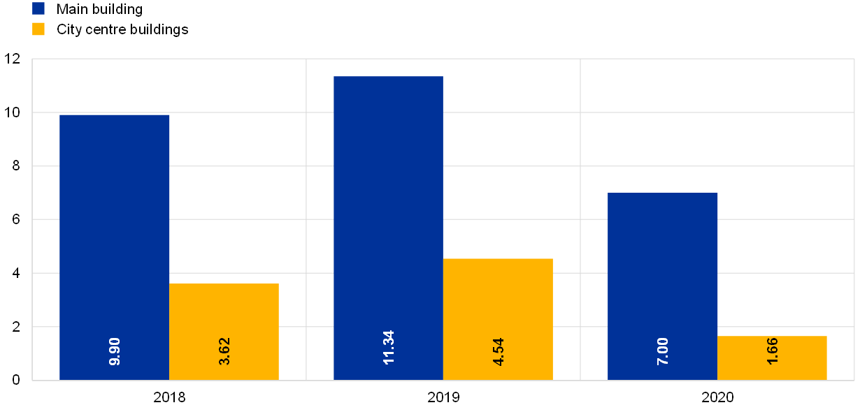 The outbreak of the global COVID-19 pandemic in 2020 has affected the ECB’s operations and everyday processes, particularly through travel bans and social distancing requirements. This led to a strongly reduced staff presence at all sites (the ECB’s main building, the Eurotower and the Japan Center) and to remote working across the entire organisation on an unprecedented scale. During much of 2020, working at the ECB’s premises was severely limited, with most staff working off-site since mid-March and the Japan Center being closed from the end of March until the beginning of August. Throughout the year, however, maintenance activities took place to ensure that the ECB’s buildings and their technical systems remained operational and continued to meet the required health and safety standards.