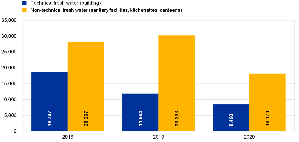 Owing to the low building occupancy rate, water consumption dropped considerably at the ECB’s premises. Nevertheless, regular flushing cycles of water pipes were conducted to meet hygiene regulations.