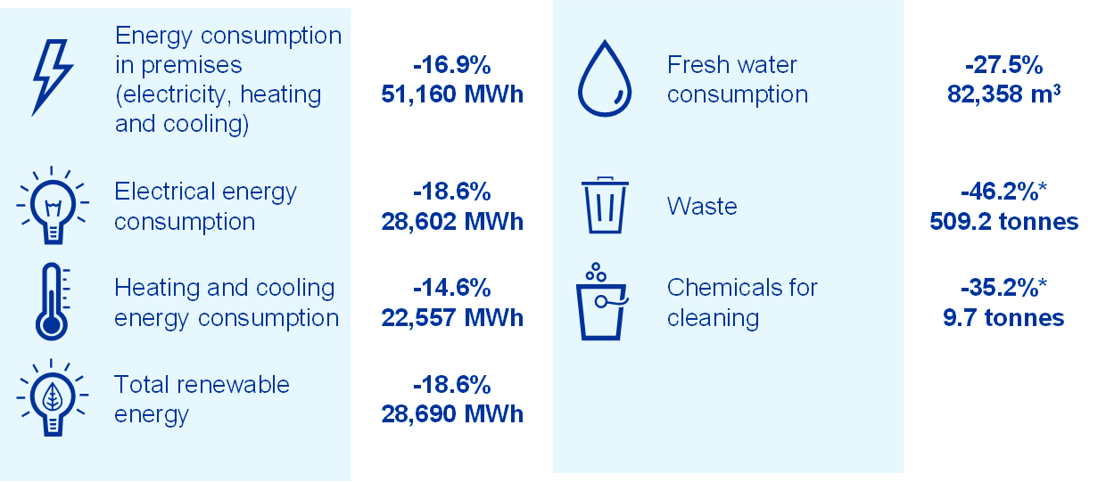 * Owing to retrospective corrections of figures for cleaning agents and organic waste for the year 2019, the indicated decrease may not match previously reported values. The adjusted figures and further information can be found in Chapter 3.3.1.3 – Cleaning agents, Chapter 3.5 – Waste and recycling and Chapter 5 – Technical information.