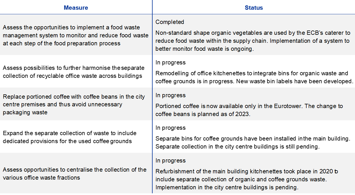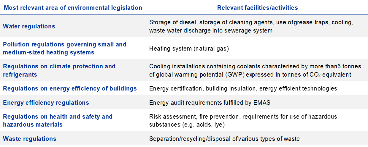 The environmental compliance obligations to be met by the ECB are defined in German and municipal regulations. All environmental obligations are summarised in a register which is reviewed and updated periodically by legal experts. Significant changes and required measures are monitored to ensure compliance with the environmental regulations. A significant part of the ECB’s compliance obligations relates to the operation and maintenance of the ECB’s buildings and contracted services, such as cleaning and catering. The ECB’s environmental compliance is assessed in the course of annual internal environmental checks. No discrepancies were detected in the latest assessments.