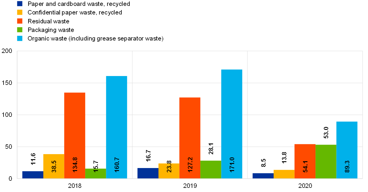 The ECB regularly assesses its environmental aspects against the following two criteria: the ability to influence them and their significance for the ECB’s environmental performance. The reduced consumption levels in 2020 show the impact of the limited on-site presence, while at the same time highlighting the basic consumption needed to keep the ECB’s premises in operation. Meanwhile, part of the consumption shifted to the homes of ECB staff, so the ECB is looking at ways to include teleworking as an indirect environmental aspect in the future.