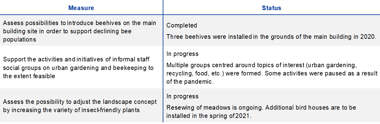 Owing to the COVID-19 pandemic, opportunities to implement further activities on site, such as the urban gardening projects proposed by staff, were limited. However, in the autumn of 2020 an online workshop on how to foster biodiversity at home was offered as part of the regular Environmental Representatives workshops.