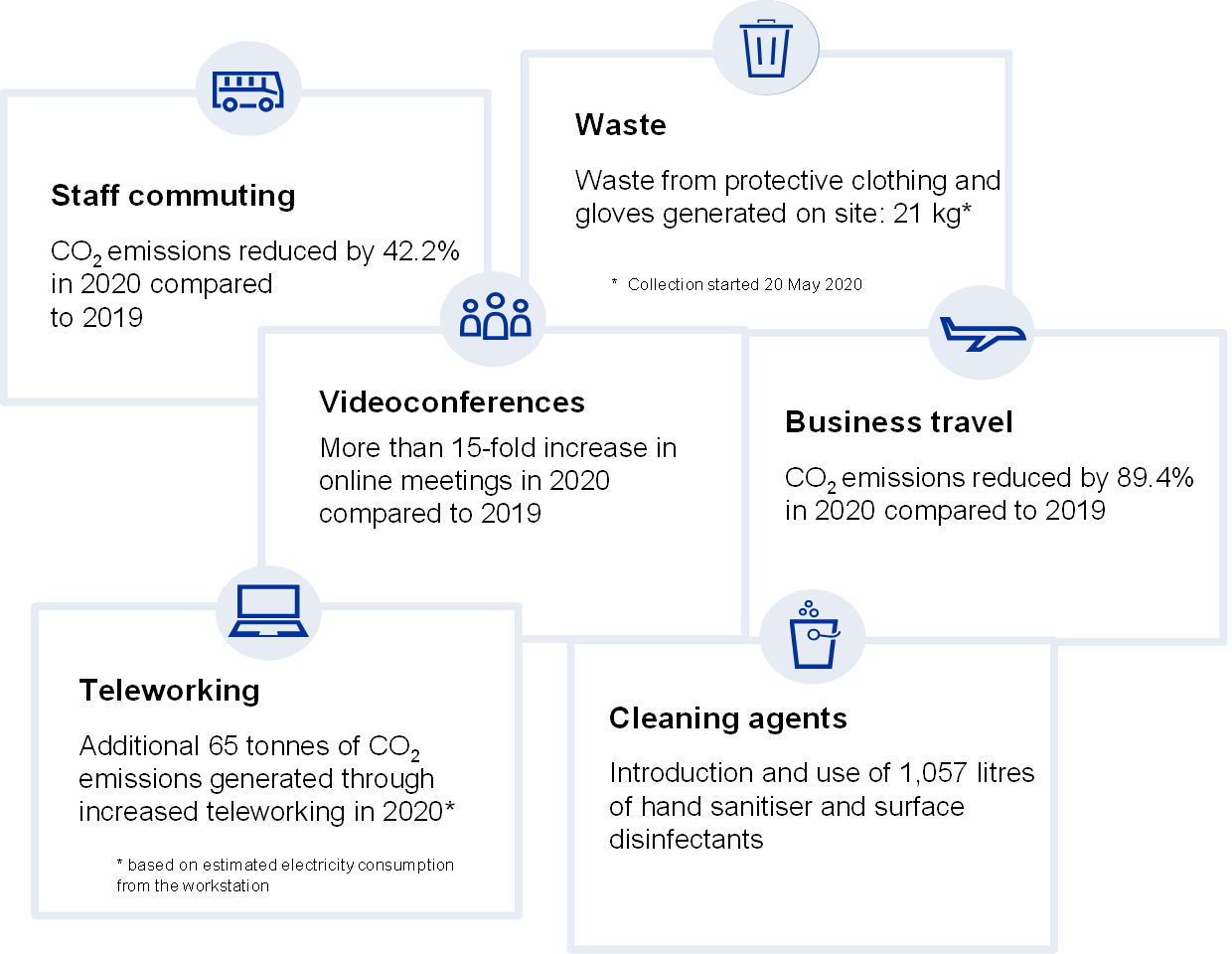 When evaluating the year’s environmental figures, the limited building occupancy needs to be taken into consideration, in particular when looking at lower consumption of energy, water and materials, as well as reduced waste generation. The ECB is also aware that some consumption was shifted from the ECB’s premises to the homes of ECB staff. Commuting and business travel emissions plummeted as meetings and work activities moved online. Consideration must also be given to indirect environmental impacts related to the increased use of information and communication technology.