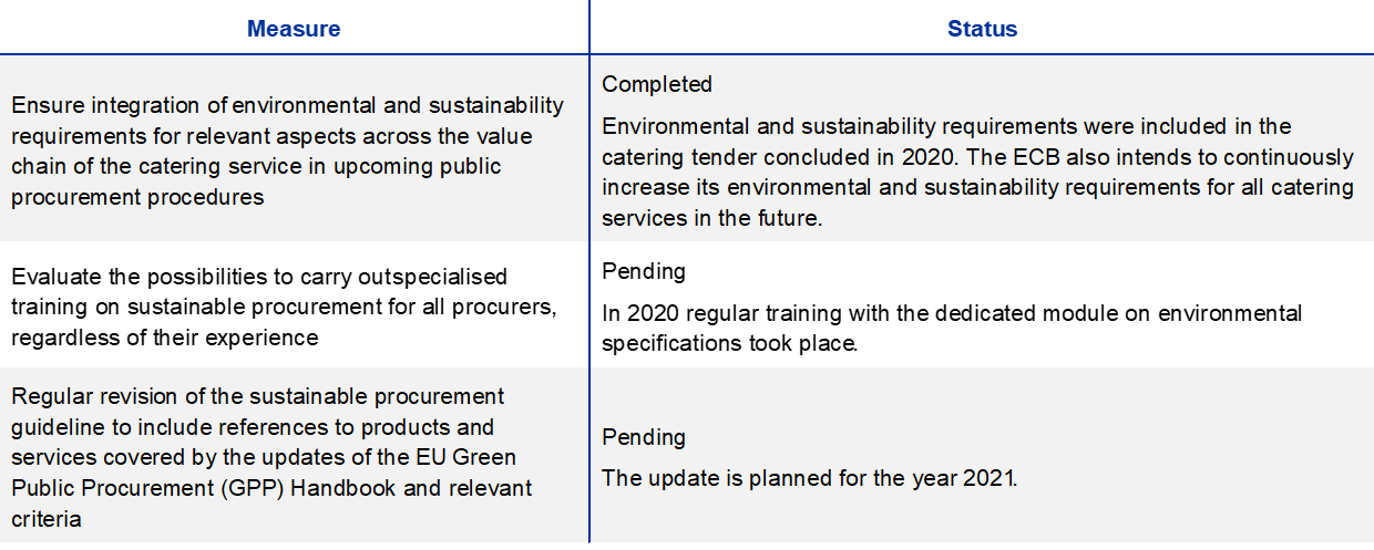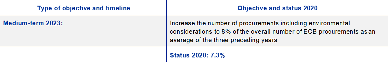 Procurement experts and teams across the ECB have several means at their disposal to include environmental considerations in procurements, the most relevant being the green award and selection criteria included in the sustainable procurement guideline and training on how to integrate environmentally friendly tender specifications.[1] Furthermore, the ECB has joined other institutions and bodies of the European Union in a joint tender for an interinstitutional GPP Helpdesk and, as of 2021, it will have access to the helpdesk services, good practices and knowledge database.