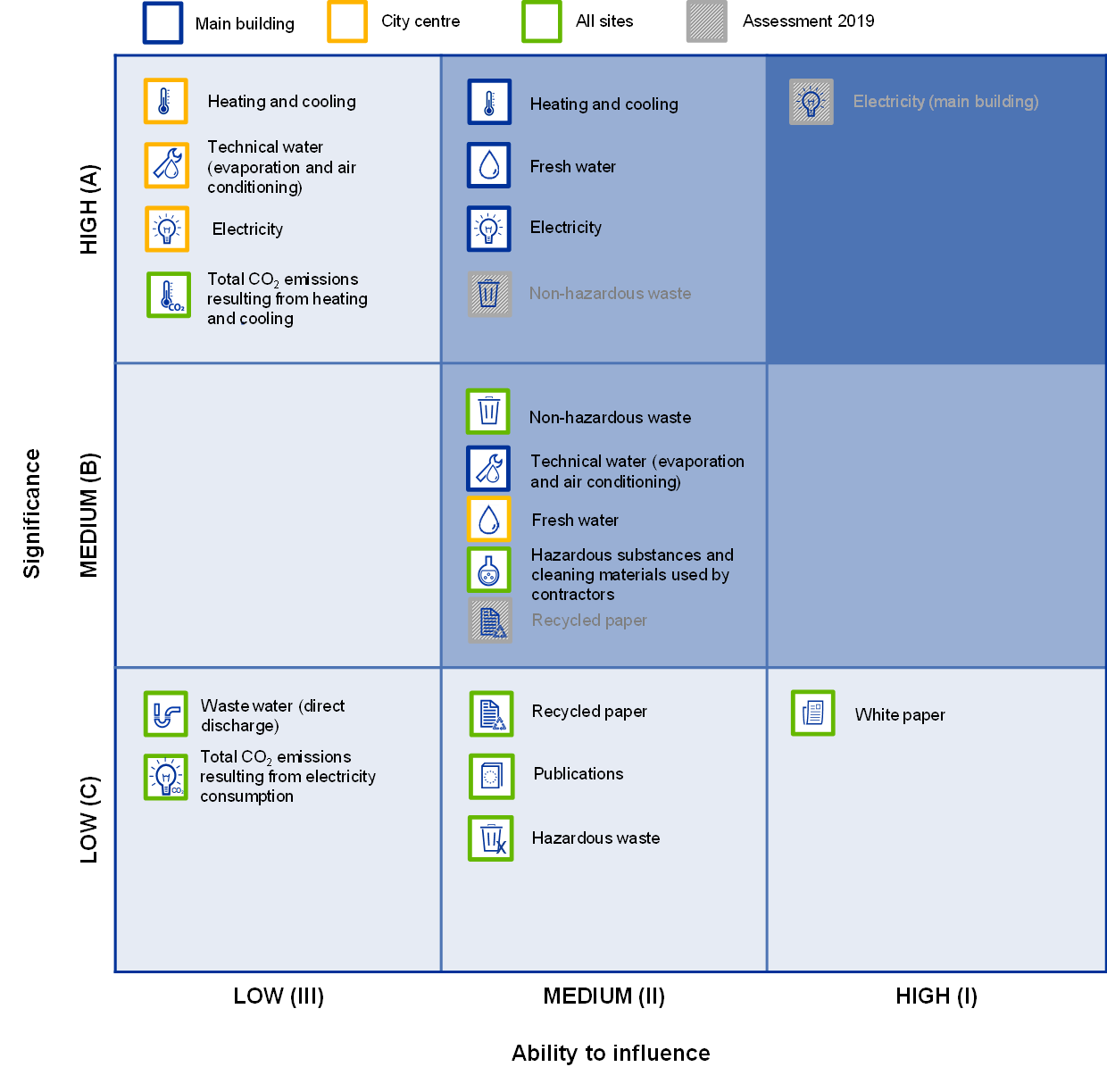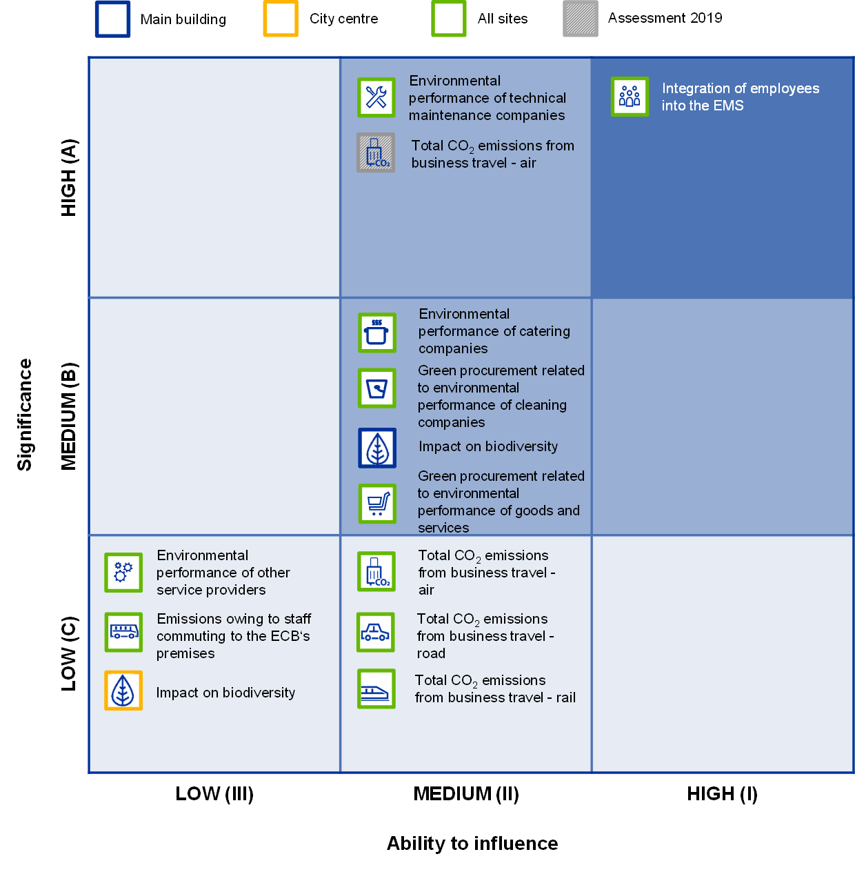 Notes: Despite limited staff presence in the main building in 2020, technical equipment and processes, such as ventilation, needed to remain operational to meet hygiene requirements. This shifted the influenceability of electricity consumption in the main building to “medium”. Teleworking and the further digitalisation of work processes led to a reduction in paper consumption. Since most of the paper used at the ECB is recycled, the decrease in paper consumption also reduced the significance of recycled paper consumption across the bank. Strong reductions in non-hazardous waste owing to low building occupancy reduced the significance of waste at the ECB’s premises. However, this continues to be closely monitored as it partly shifted to the homes of ECB staff.