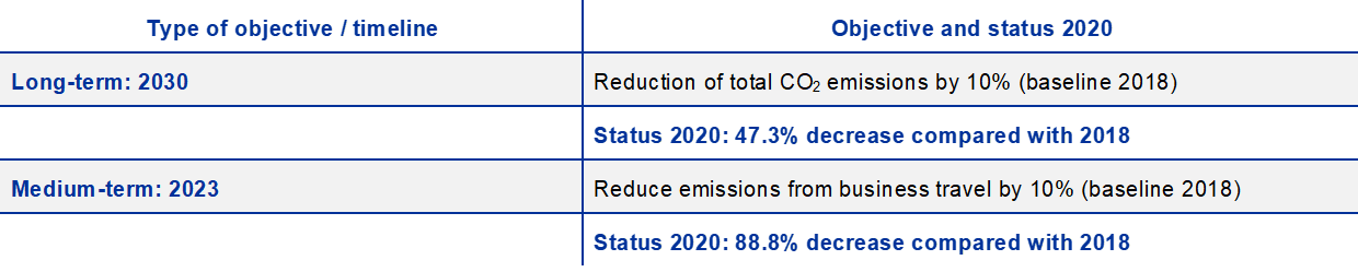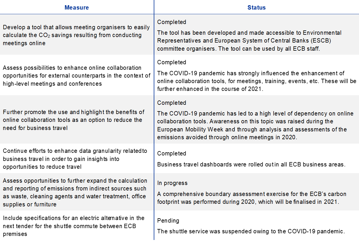 To improve its monitoring and control of business travel-related emissions once restrictions are reduced, the ECB finalised several data analytics projects to refine the collection and monitoring of data, raise awareness of the environmental impact of business travel and identify further opportunities to reduce travel and event-related emissions. These projects include a tool to help meeting and event organisers to estimate the emissions avoided by implementing online meetings instead of face-to-face meetings.