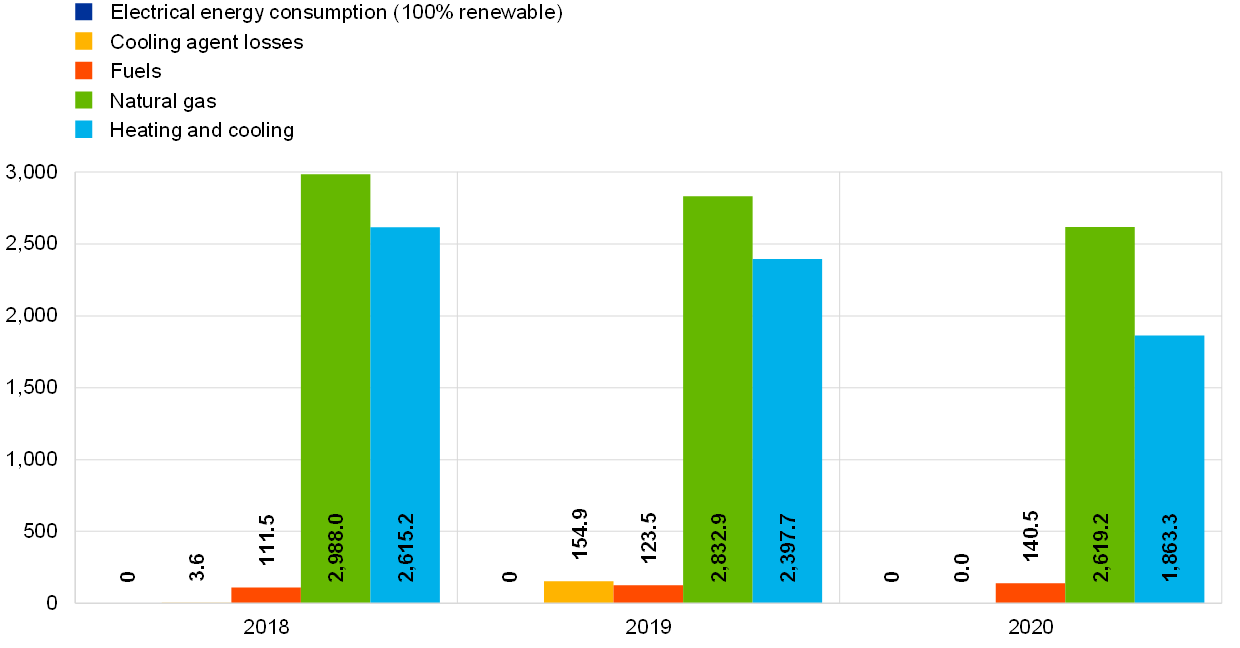 In 2019 Scope 1 and 2 emissions accounted for approximately 50% of the ECB’s total reported CO2 emissions. In 2020, this share grew considerably to 78.4%, mostly as a result of decreasing Scope 3 emissions. Emissions from Scopes 1 and 2 are directly related to the operation of the ECB premises. They mainly cover the consumption of heating and cooling energy as well as fuel consumption. The ECB does not report emissions related to electricity consumption in Scope 2, as 100% of the electricity has been purchased from renewable sources since 2016. However, increasing energy efficiency and reducing energy consumption remain high priorities for the ECB’s environmental management.