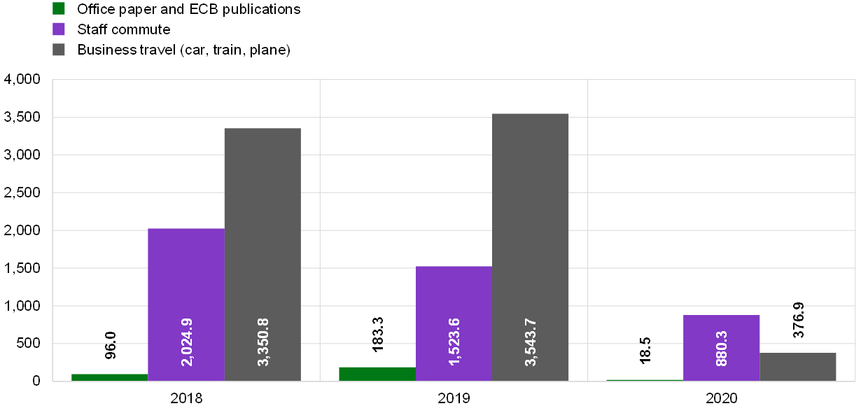 Notes: Emissions from office paper and ECB publications have been adjusted on the basis of an improvement in the monitoring and reporting process from 87.7 tonnes to 96.0 tonnes in 2018 and from 138.3 tonnes to 183.3 tonnes in 2019. Emissions from business travel have been adjusted from 3,583.2 tonnes to 3,543.7 tonnes in 2019.