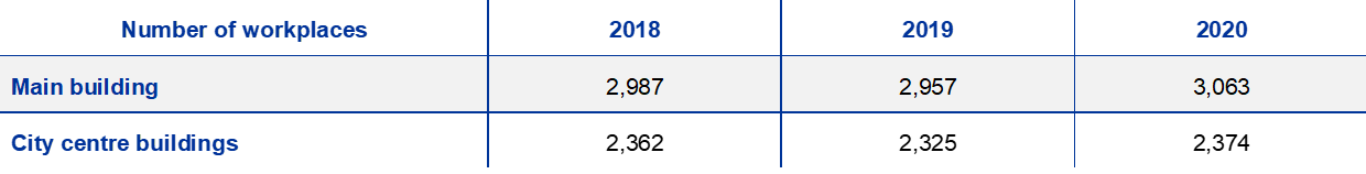 Environmental data for 2020 in the environmental statement relate to the three premises occupied by the ECB: the main building, which is owned by the ECB, and the Eurotower and the Japan Center, both of which are rented. Owing to gradually rising staff numbers in recent years, the ECB has occupied the entire office space of all three buildings since 2018. In 2020 the number of workplaces increased by 2.9% compared with the year before.