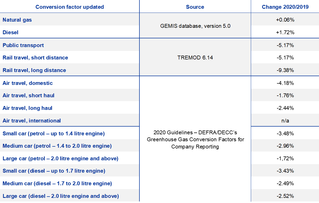Percentage differences between the CO2 emission conversion factors applied to calculate the emissions in 2019 and 2020 are provided in the following table. These differences are based on the most recent conversion factors of the respective sources.[4]