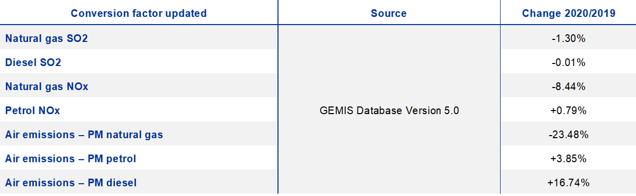 Conversion factors used in the calculation of CO2 emissions are updated annually. Updates of emission factors in 2020 are presented in Chapter 5 – Technical information.