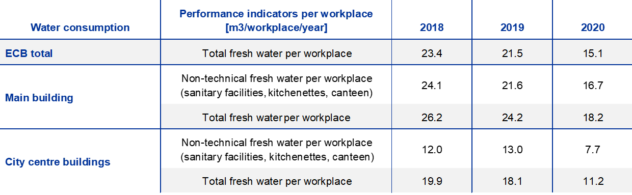 The ECB’s water consumption comprises technical water used for building climate control, and non-technical water used in sanitary facilities, kitchenettes and canteens. At the main building, non-technical water also covers water used for irrigating the green areas. This difference needs to be considered when comparing water consumption of the main building and the city centre premises.