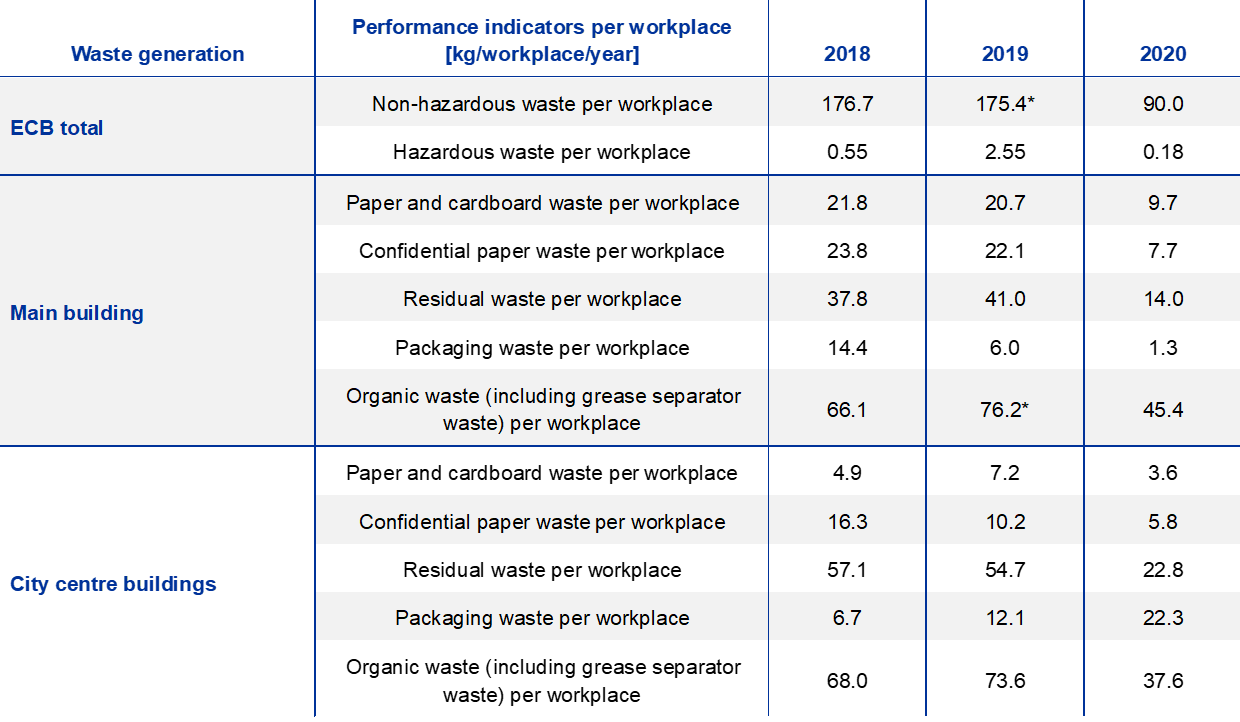 Notes: * The amounts of organic waste for 2019 have been adjusted on the basis of an improvement in the monitoring and reporting process. Amounts in the main building were adjusted from 69.4 kg to 76.2 kg per workplace in 2019. As a result, the total amount of non-hazardous waste per workplace was changed from 171.6 kg to 175.4 kg in 2019.