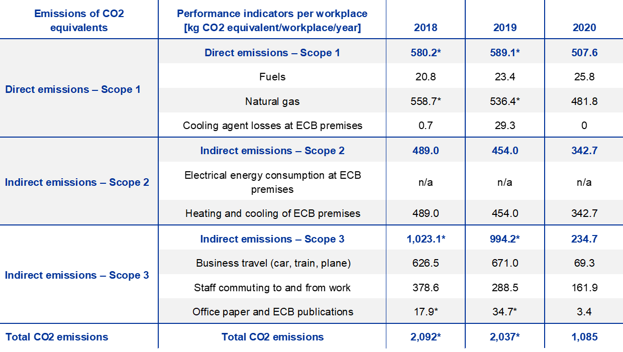 Notes: * Emissions from natural gas and from office paper and ECB publications for 2018 and 2019 and emissions from business travel for 2019 have been adjusted on the basis of an improvement in the monitoring and reporting process. Emissions from natural gas were changed from 502.0 kg to 558.7 kg per workplace in 2018 and from 491.2 kg to 536.4 kg per workplace in 2019. Emissions from office paper and ECB publications were changed from 16.4 kg to 17.9 kg per workplace in 2018 and from 26.2 kg to 34.7 kg per workplace in 2019. Emissions from business travel were changed from 678.5 kg to 671.0 kg per workplace in 2019. As a result, the emissions from Scope 1 were changed from 523.5 kg to 580.2 kg per workplace in 2018 and from 543.9 kg to 589.1 kg per workplace in 2019. Emissions from Scope 3 were changed from 1,021.5 kg to 1,023.1 kg per workplace in 2018 and from 993.1 kg to 994.2 kg per workplace in 2020. Total CO2 emissions were changed from 2,034 kg to 2,092 kg per workplace in 2018 and from 1,991 kg to 2,037 kg per workplace in 2019.