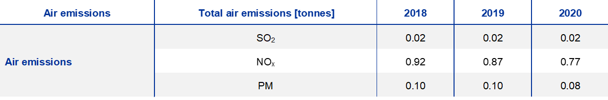 Apart from the already presented CO2 emissions, emitted amounts of sulphur dioxide (SO2), nitrogen oxides (NOx) and particulate matter (PM) are also assessed and reported. These emissions result from the ECB’s car fleet, test runs of emergency power units and natural gas consumption. The corresponding figures can be found in Chapter 5 – Technical information.