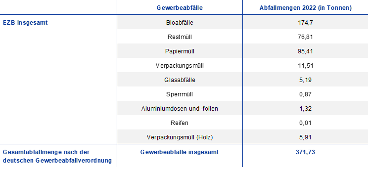 Die Gesamtabfallmenge nach der deutschen Gewerbeabfallverordnung belief sich 2022 auf 371,73 Tonnen. Davon entfielen 294,9 Tonnen auf getrennt gesammelten Gewerbeabfall (d. h. ohne Restmüll). Der getrennt gesammelte Gewerbeabfall machte im Jahr 2022 79 % des Gesamtabfalls nach der Gewerbeabfallverordnung aus. Der Restmüll wird in einer zertifizierten Abfallbehandlungsanlage vorsortiert.