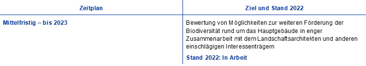 In den letzten Jahren hat die EZB ihre Bemühungen fortgesetzt, die Biodiversität auf ihren Grundstücken zu fördern. 2022 wurden Rasenflächen mit einer Größe von 2 000 m² zu Wiesen mit regionalen Wildblumen umgestaltet und eine weitere Wiese angesät (sodass nunmehr insgesamt Wiesen mit einer Fläche von 23 490 m² in den Grünanlagen des Hauptgebäudes angelegt wurden).