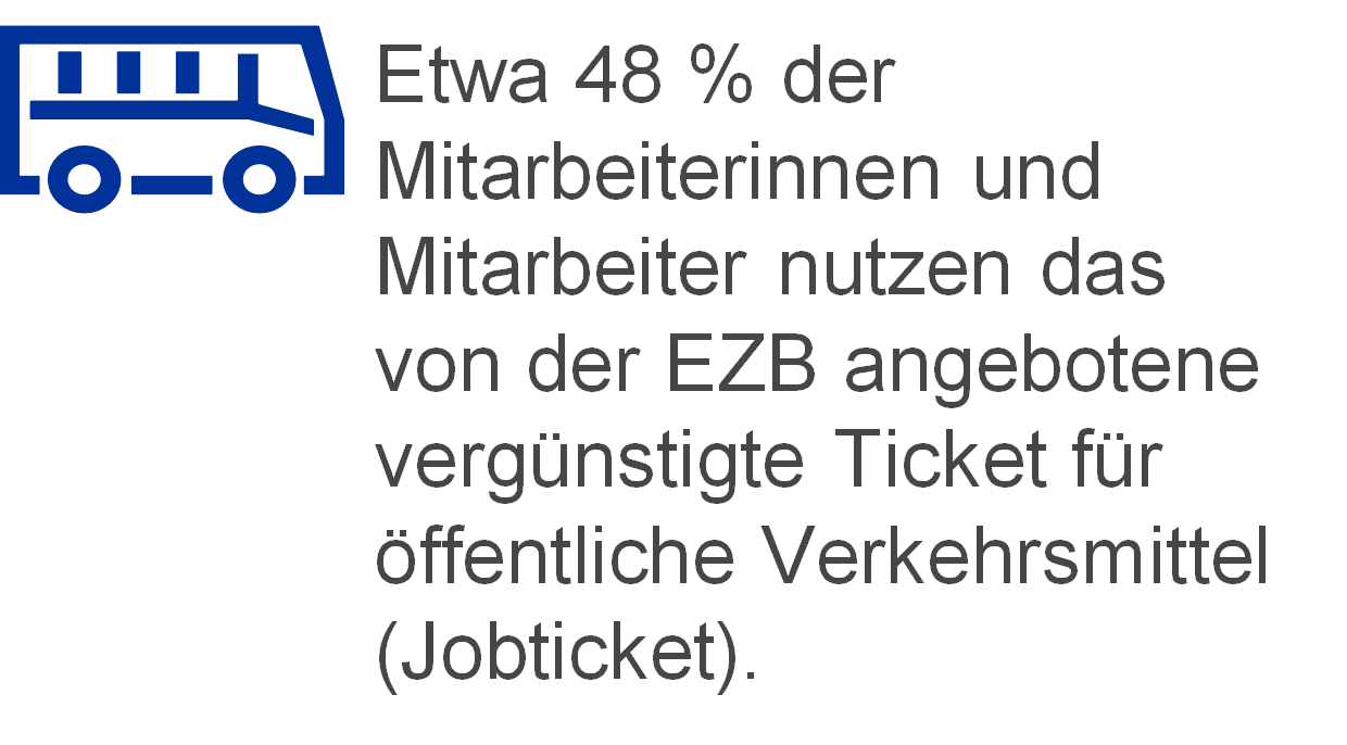 Für die interne Kommunikation stehen seit Anfang 2015 Lösungen für Videokonferenzen mit kleinem Teilnehmerkreis sowie Tools für Instant-Messaging und sichere Telekonferenzen zur Verfügung. Um den Einsatz neuer Kommunikationstechnologien zu erleichtern, bieten IT-Teams interessierten Teams Tutorials an. Ferner empfehlen die Reiserichtlinien der EZB, dass Flüge (in der Regel in der Economy Class) nur dann eine Option sind, wenn die Reise zum Zielort mit einem anderen Verkehrsmittel mehr als vier Stunden dauern würde. Die mit dem Arbeitsweg von externen Dienstleistern verbundenen Emissionen wurden ebenfalls berücksichtigt, indem entsprechende Kriterien zur Förderung der externen Erbringung von Dienstleistungen in die Ausschreibungen aufgenommen wurden.