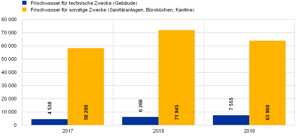 Anmerkung: *In der Umwelterklärung der EZB 2019 waren anstatt der Wasserverbrauchswerte pro Arbeitsplatz in den Gebäuden im Stadtzentrum in den Jahren 2017 und 2018 fälschlicherweise die Werte für 2016 und 2017 angegeben. Außerdem wurden die Anteile des Wasserverbrauchs für sonstige Zwecke in den Gebäuden im Stadtzentrum und im Hauptgebäude im Jahr 2018 aufgrund einer Verbesserung im Kontroll- und Meldeprozess korrigiert. Daher wurden die Zahlen für den Frischwasserverbrauch insgesamt pro Arbeitsplatz für das Hauptgebäude, die Gebäude im Stadtzentrum und die ganze EZB korrigiert. Für die Gebäude im Stadtzentrum wurde der Wasserverbrauch für sonstige Zwecke pro Arbeitsplatz von 12,0 m³ in 12,5 m³ im Jahr 2017 und von 12,5 m³ in 12,0 m³ im Jahr 2018 berichtigt. Der Frischwasserverbrauch insgesamt pro Arbeitsplatz wurde von 17,8 m³ in 20,3 m³ im Jahr 2017 und von 20,3 m³ in 19,9 m³ im Jahr 2018 berichtigt. Für das Hauptgebäude wurde der Wasserverbrauch für sonstige Zwecke pro Arbeitsplatz von 17,3 m³ in 24,1 m³ im Jahr 2018 korrigiert, und der Frischwasserverbrauch insgesamt pro Arbeitsplatz wurde von 19,4 m³ in 26,2 m³ im Jahr 2018 korrigiert. Für die gesamte EZB wurde der Frischwasserverbrauch insgesamt pro Arbeitsplatz von 19,6 m³ in 23,4 m³ im Jahr 2018 berichtigt.