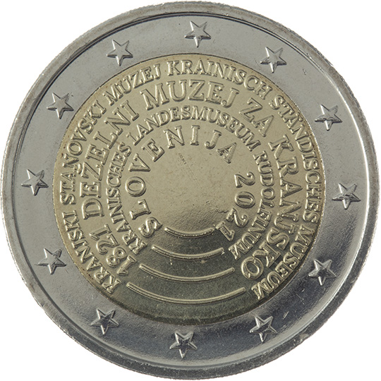 Deskrizzjoni: Id-disinn kien ispirat miċ-ċinturini minn Vače Situla – wieħed mill-ifjen oġġetti tal-arti situla. Dawn iċ-ċinturini huma simbolu grafiku għall-istratifikazzjoni tal-istorja li l-mużew għandu għall-ġenerazzjonijiet futuri. Id-disinn juri l-fażijiet tal-istorja tal-mużew b’ismijiet differenti tul l-istorja twila tiegħu ta’ 200 sena L-ismijiet jintwerew fiċ-ċinturini kif kienu jkunu kieku nkitbu fuq Vače Situla. Id-disinn jinkludi l-isem tal-pajjiż “SLOVENJA” u s-sena tal-ħruġ “2021”. Fiċ-ċirku ta’ barra tal-munita hemm it-12-il stilla tal-bandiera Ewropea.