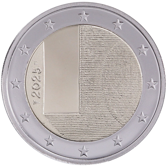 Description: The design features an abstract door symbolizing state visits, with a mirror-finish rectangular shape. The mintmark, the year 2025, and the lettering “FI” are positioned vertically along the left edge of the rectangle. The rectangle has a rounded top that follows the edge of the coin. Below and to the right, the surface is grooved with horizontal lines, while a circular shape intersects the curve of the image area. The coin’s outer ring bears the 12 stars of the European flag.