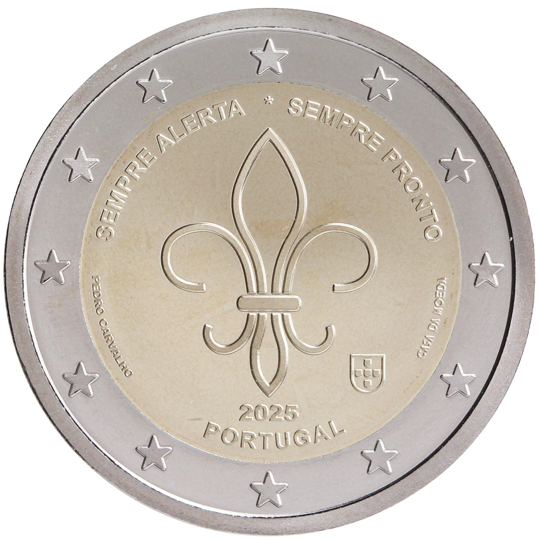 The design shows a fleur-de-lis, the most universal symbol of Scouting. Surrounding this central motif are several inscriptions: above, the phrase “Sempre alerta. Sempre pronto” —the two Portuguese translations of Baden-Powell’s motto ‘Be Prepared,’ used by the two major Scouting organizations in Portugal; to the left, the name of the designer; below, the era and issuing country, “Portugal” ; and to the right, the national coat of arms of Portugal, followed by the mintmark “Casa da Moeda”. The coin’s outer ring bears the 12 stars of the European flag.