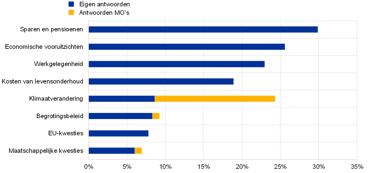 Naast prijsstabiliteit noemen respondenten een groot aantal thema’s waarmee de ECB naar hun mening rekening zou moeten houden bij het bepalen van haar beleid. Enkele daarvan zijn in grafiek 11 weergegeven. Het betreft vaak dezelfde onderwerpen die als secundaire doelen van de ECB in de inleiding tot dit thema worden genoemd.