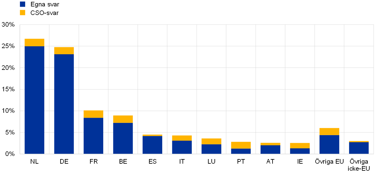 Sett till den geografiska fördelningen kommer en majoritet av svaren från Nordväst- och Centraleuropa (se diagram 2, panel a). Nederländerna står för flest svar, med en andel på 27 procent. Detta beror framför allt på att en nederländskspråkig tidskrift rapporterade om portalens lansering i februari och att det då fanns en direktlänk till portalen i en artikel. Nederländerna följs av Tyskland (25 procent), Frankrike (10 procent) och Belgien (9 procent). Spanien och Italien står vardera för 4 procent. De östeuropeiska länderna har en marginell andel av svaren (under 2 procent). I Portugal, Irland, Luxemburg och Italien varierade andelen CSO-svar från en fjärdedel till mer än hälften.