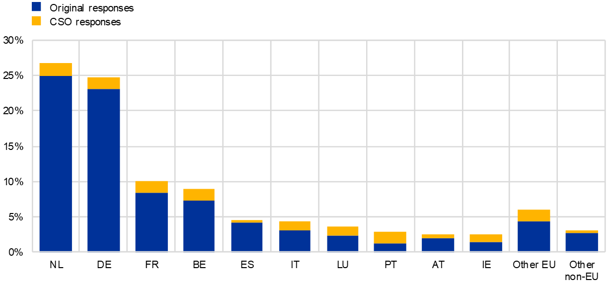 In geographical terms, responses from central and north-western Europe account for the vast majority (see Chart 2, Panel a). The Netherlands is the largest contributor with a 27% share; this is partially due to a Dutch language magazine that covered the launch of the Portal in February and provided a direct link to it in an article. The Netherlands is followed by Germany (25%), France (10%) and Belgium (9%). Spain and Italy each account for 4%. Eastern European countries have a marginal share of responses (less than 2%). In Portugal, Ireland, Luxembourg and Italy, the share of CSO responses range from one-quarter of the responses to more than half.