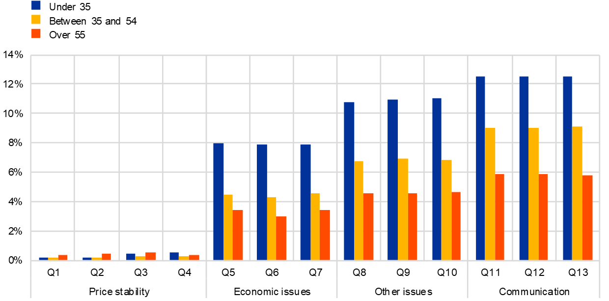 On the ECB Listens Portal, the thirteen questions for respondents were presented over four pages, each page covering one specific theme. As the questionnaire progressed, the percentage of blank responses increased, as shown in Chart 15, Panel a. For the questions on the first theme of “price stability”, the percentage was less than 1%, while for the questions on the last theme of “communication”, the percentage rose to nearly 9%. The most drastic increase occurred between the first theme and the second theme of “economic expectations and concerns”. As the percentage of blank responses is similar for questions under each theme, no question seems to stand out as either harder or less interesting.