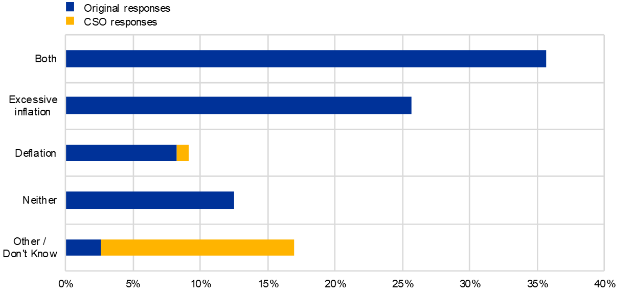 Around 10-15% of respondents were not concerned (at least not for the time being). The remainder of the sample did not know (“I don't know economy so well to be able to answer this”, “I must confess I do not know the difference, even if I consider myself an educated professional”) or was concerned about other issues. Some respondents, for example, mentioned low interest rates, unemployment rates and climate change. This group included Greenpeace responses, which stated that, although both excessive inflation and deflation are potentially a problem, they are not nearly as important as the protection of the environment.