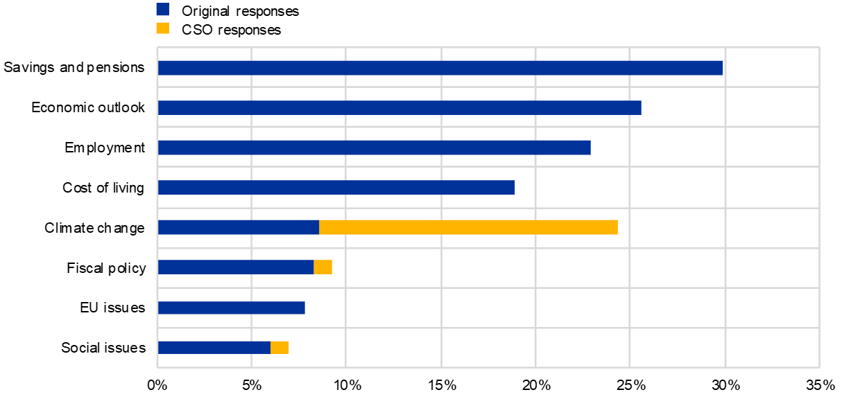 Civil society organisations (CSOs) drew attention to the ECB’s strategy review. Some of these organisations, most notably Greenpeace, called on the public to submit contributions to the ECB Listens Portal, offering standard answers that could be copied into the survey. Overall, around 14% of all responses were copy-paste answers provided by Greenpeace. Another 1% came from other CSOs. As such, original answers amounted to 85% of the sample.