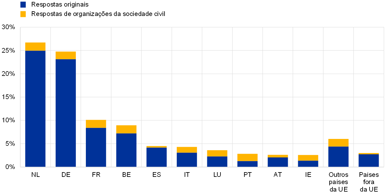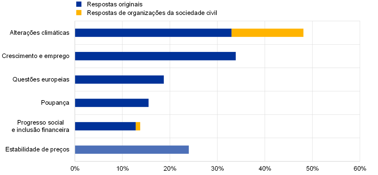 As organizações da sociedade civil chamaram a atenção para o reexame da estratégia do BCE. Algumas, nomeadamente a Greenpeace, apelaram a que o público apresentasse o seu contributo no portal “O BCE escuta” e disponibilizaram respostas‑padrão que podiam ser copiadas para o questionário. Globalmente, cerca de 14% das respostas corresponderam a respostas‑padrão disponibilizadas pela Greenpeace. Outras organizações da sociedade civil foram responsáveis por mais 1% das respostas. Nessa medida, as respostas originais representaram 85% da amostra.