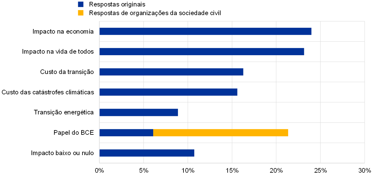 Os contributos de organizações da sociedade civil e cerca de 6% das respostas originais focaram o papel do BCE no combate às alterações climáticas, sendo as opiniões bastante divergentes. Em consonância com as razões apresentadas na secção anterior, muitas das respostas originais alertaram contra as alterações climáticas passarem a ser “um domínio do BCE”. “[As alterações climáticas] terão provavelmente impacto a certa altura, mas não compete ao BCE dar resposta ao problema – ao mesmo tempo, também não deve agravar a situação”, dizia uma das críticas mais moderadas ao potencial envolvimento do BCE. Alguns respondentes recomendaram que o BCE não desempenhasse um papel de liderança (devendo este ser das instâncias democraticamente eleitas), mas atuasse mais como facilitador. Outros contributos, nomeadamente de organizações da sociedade civil, instaram o BCE a, ao invés, agir de forma decisiva, “dar o exemplo” e contribuir para os objetivos europeus nos termos do seu mandato secundário.