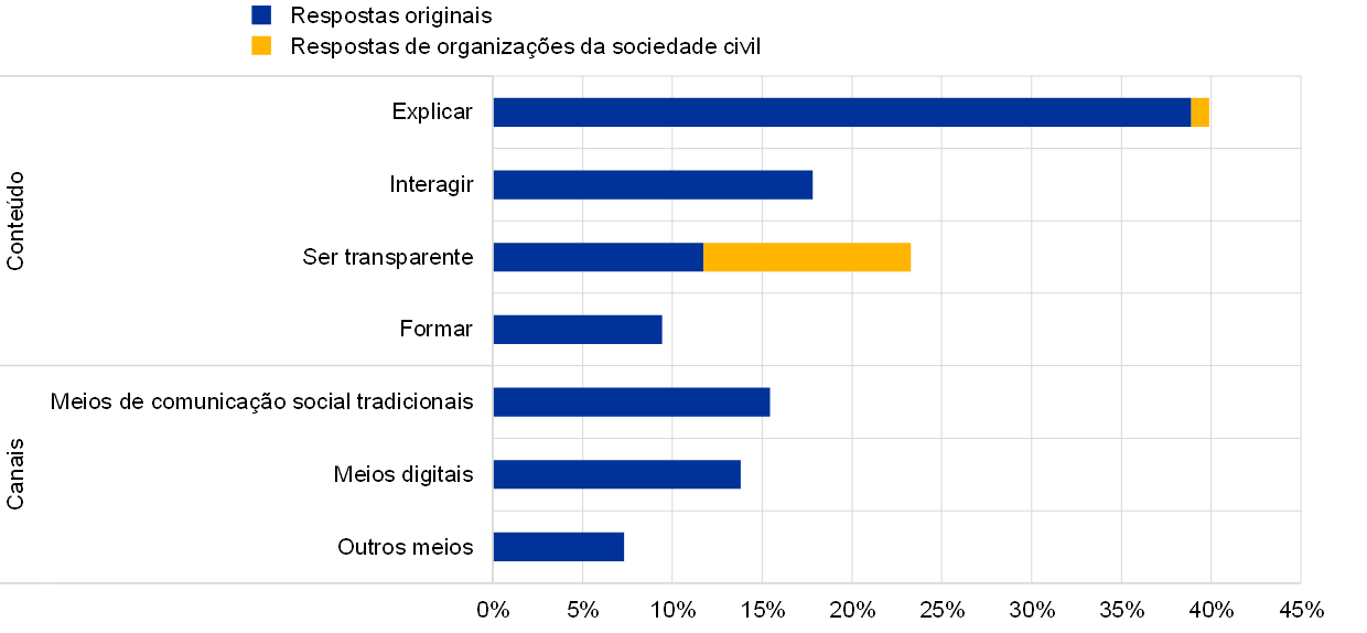 Cerca de 10% das respostas recomendaram uma abordagem mais gradual no desenvolvimento dos conhecimentos do público e incluíram as seguintes sugestões: “começar do zero e explicar à população como funciona a taxa de política monetária e como os órgãos [de decisão] são compostos […]”, bem como “aproximar‑se das pessoas comuns que podem não ter grandes conhecimentos de economia, mas que se preocupam com o assunto”.