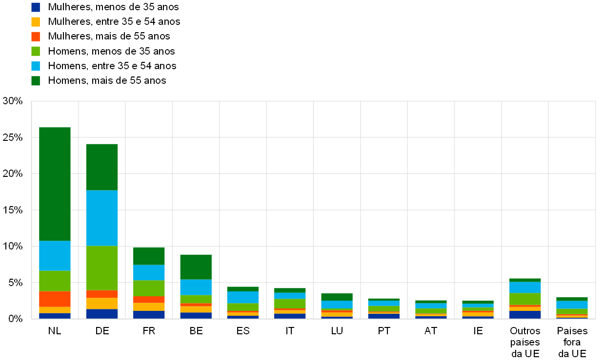 Em termos de diferenças nas características sociodemográficas entre países, o que se destaca é que 67% dos respondentes dos Países Baixos são pessoas com mais de 55 anos (59% homens e 8% mulheres). A percentagem de pessoas de idade mais avançada também é significativa na Bélgica (43%) e no Luxemburgo (37%). Os países com a maior percentagem de contributos de mulheres são os que têm uma maior percentagem de respostas de organizações da sociedade civil: Irlanda, Portugal, Itália e Luxemburgo (ver o painel B do gráfico 2).