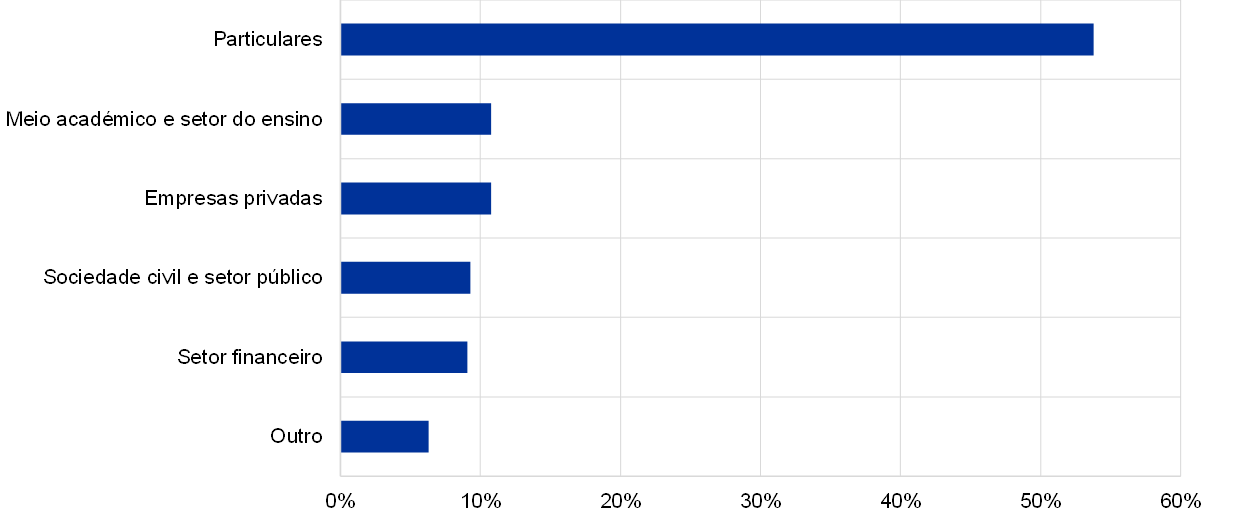 Analisando a distribuição setorial, os particulares são os mais representados, com 54%, seguindo‑se as empresas privadas (11%), os membros do meio académico e do setor do ensino (11%) e os participantes do setor financeiro (9%) (ver o gráfico 3).