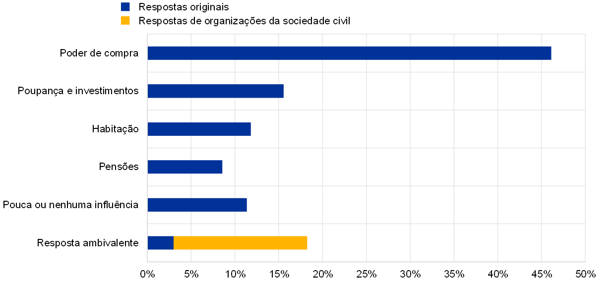Outros respondentes afirmaram que as taxas de juro baixas lhes tinham permitido comprar casa, com condições mais favoráveis, ou criar uma empresa. No entanto, outros apontaram para elementos estruturais que os impedem de beneficiar plenamente das condições de crédito favoráveis, como, por exemplo, a precariedade do emprego: “[…] gostaria de pedir um empréstimo para comprar casa, mas não tenho garantia de emprego e, portanto, não posso”; “as políticas monetárias da UE possibilitam que jovens como eu sejam muito proativos no empreendedorismo, contudo, as políticas locais constituem um obstáculo, com impostos extremamente elevados e a falta de políticas de apoio”; e “mesmo uma inflação baixa não compensa a falta de acesso a crédito para empréstimos e hipotecas”.