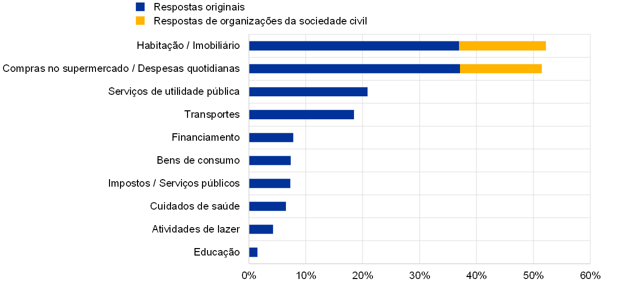 As demais categorias foram mencionadas em menos de 10% dos contributos. Estas abrangeram serviços relacionados com o financiamento, tais como custos bancários[7] (mencionados com um pouco mais de frequência pelos homens do que pelas mulheres), bens de consumo, impostos e o custo dos serviços públicos (sendo os respondentes de idade mais avançada a sentir‑se particularmente afetados) e, por último, despesas relacionadas com a saúde, nomeadamente seguros de saúde, faturas médicas e despesas dentárias (mostrando‑se as mulheres e os participantes de idade mais avançada especialmente preocupados). Apenas alguns respondentes referiram as atividades de lazer (como viagens, restaurantes, cinemas e desporto), a educação ou os cuidados infantis. Um número ainda menor mencionou os custos do lado da oferta, tais como os custos de mão de obra e das matérias‑primas.
