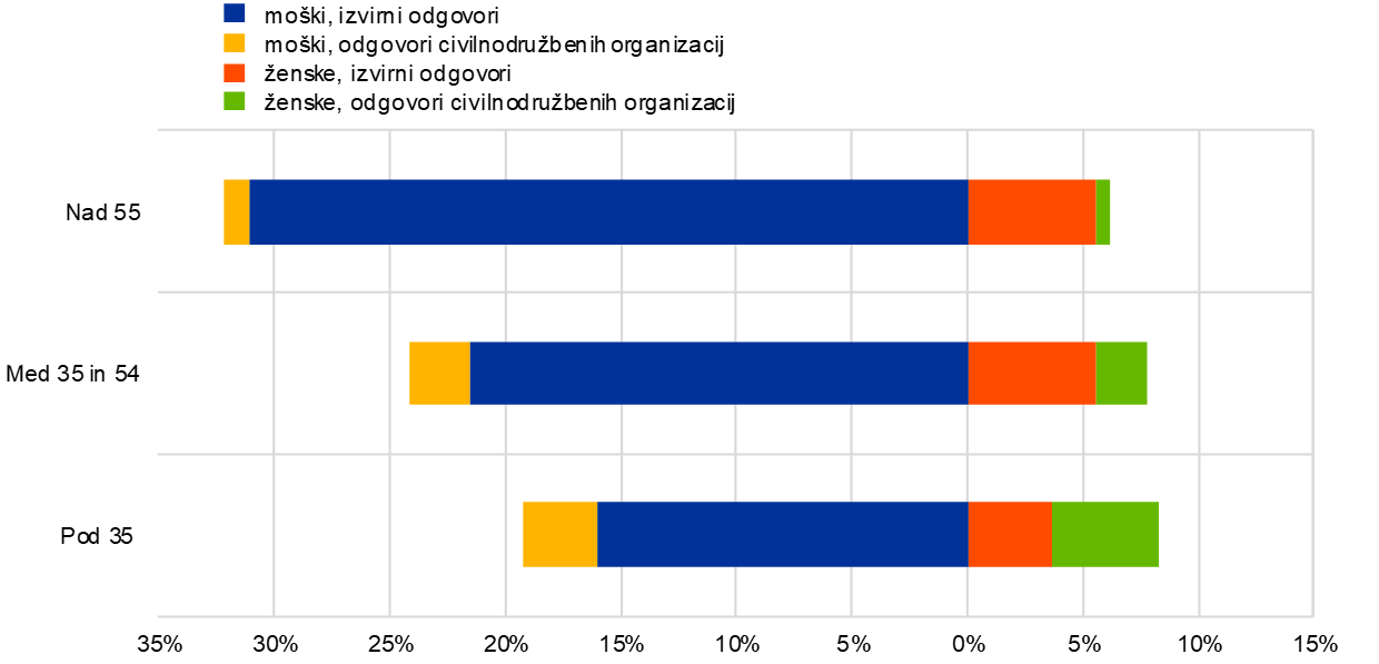 Pomembno je upoštevati, da podatki, zbrani z javnim posvetovanjem, ne dajejo reprezentativnega pogleda na prebivalstvo, saj so se udeleženci za sodelovanje v anketi izbrali sami. V skladu s priporočilom in najboljšimi praksami Evropske komisije[2] nismo uporabili tehnik tehtanja, ampak smo izvedli analizo po socialno-demografskih skupinah.