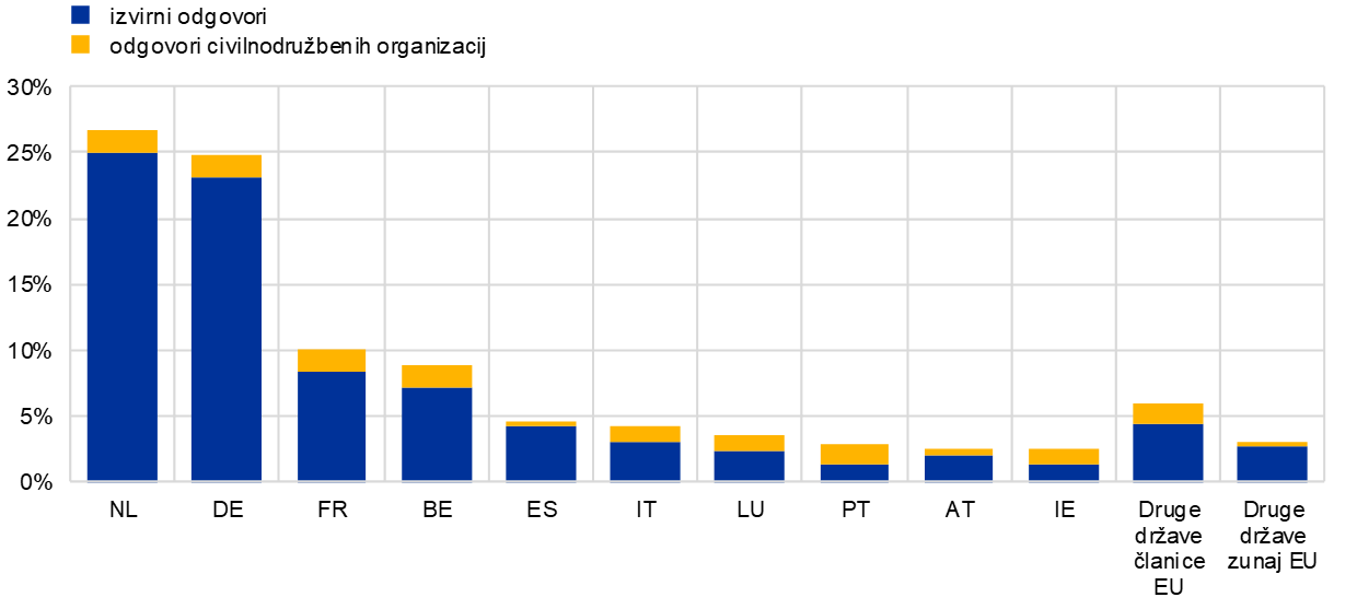Gledano geografsko je velika večina prispevkov prišla iz srednje in severozahodne Evrope (glej graf 2, panel a). Med njimi jih je največ, 27%, prispevala Nizozemska, za kar je deloma zaslužna revija v nizozemščini, ki je februarja poročala o začetku delovanja portala in v enem od člankov navedla neposredno povezavo na portal. Nizozemski sledijo Nemčija (25%), Francija (10%) in Belgija (9%). Španija in Italija imata obe 4-odstotni delež. Delež vzhodnoevropskih držav je zelo majhen (manj kot 2%). Na Portugalskem, Irskem, v Luksemburgu in Italiji se delež odgovorov civilnodružbenih organizacij giblje od ene četrtine do več kot polovice.