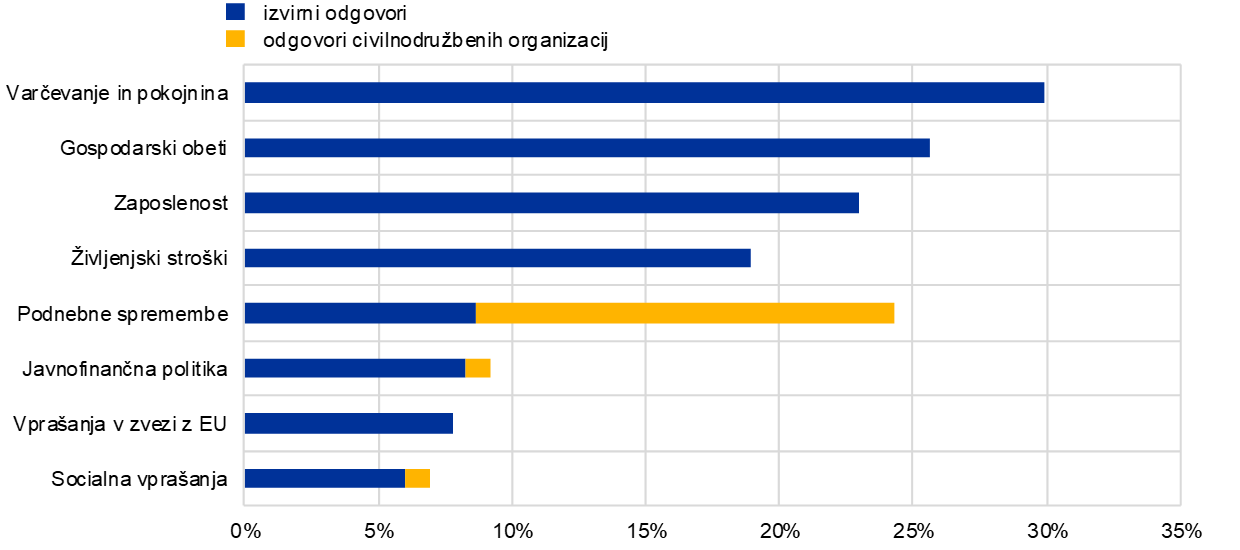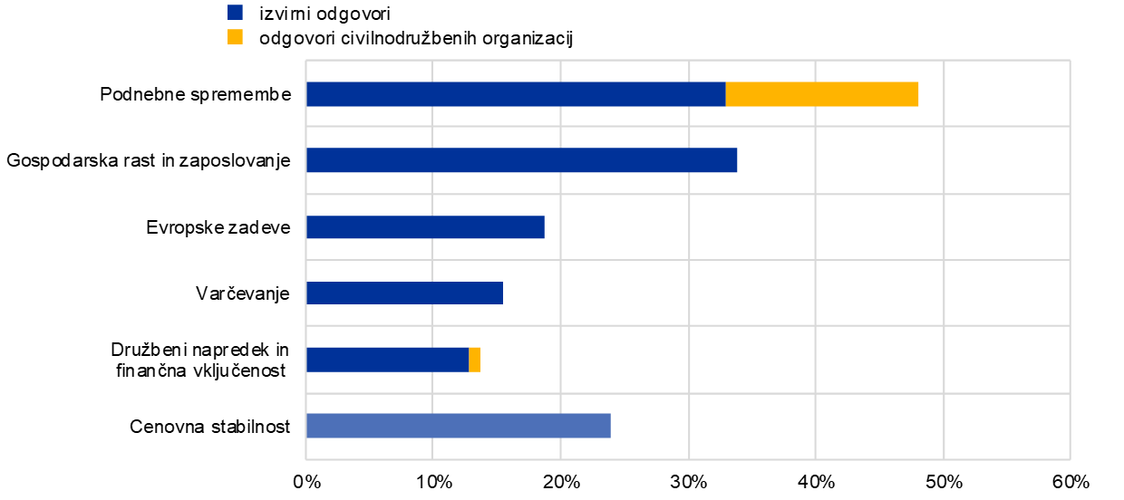 Anketiranci so navedli še vrsto drugih tem, ki naj bi jih ECB poleg cenovne stabilnosti upoštevala pri odločanju o svojih politikah. Nekatere so prikazane v grafu 11. Mnoge med njimi so bile enake sekundarnim ciljem, ki so navedeni v uvodu k tej temi.