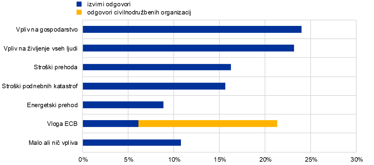 - Precejšnje število anketirancev je navedlo, da bi morala ECB prevzeti dejavnejšo vlogo pri vzdrževanju gospodarske rasti, spodbujanju zaposlovanja, boju proti podnebnim spremembam, spodbujanju evropskega povezovanja (tudi v zadevah, za katere ECB ni odgovorna, kot je obdavčitev) ter boju proti revščini in neenakosti.