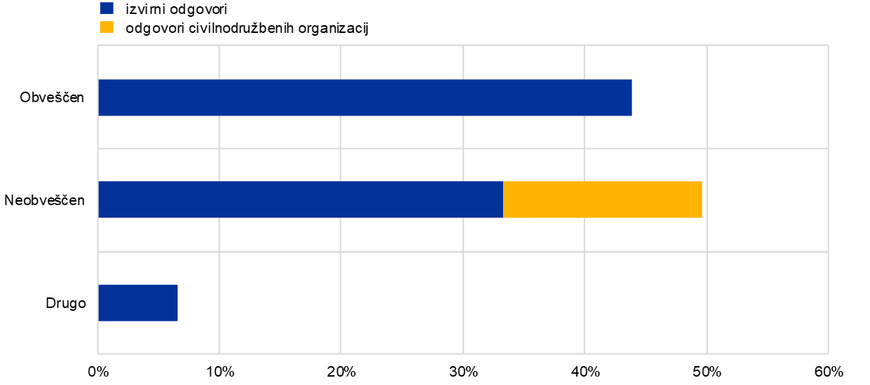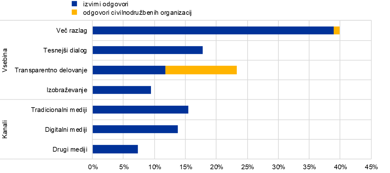 - Številni anketiranci so navedli, da si želijo preglednejše razlage odločitev ECB, v katerih so pojasnjeni tudi razlogi zanje in učinki sprejetih politik, med drugim koristi, tveganja in negativne posledice teh politik.