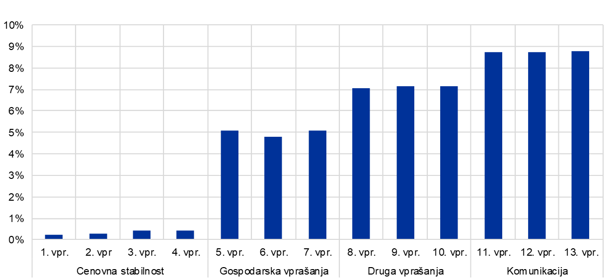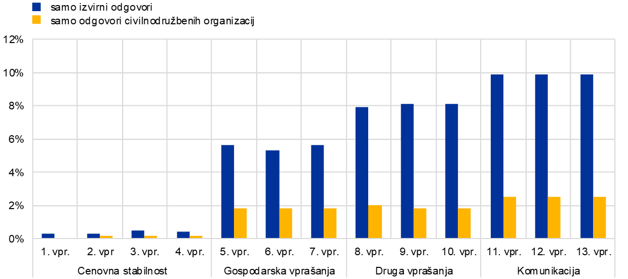 Na portalu »ECB vas posluša« je bilo trinajst vprašanj za udeležence ankete predstavljenih na štirih straneh, pri čemer je vsaka stran obravnavala eno temo. Z napredovanjem vprašalnika se je odstotek praznih odgovorov povečeval, kot je prikazano v grafu 15, panel a. Pri vprašanjih o prvi temi »cenovna stabilnost« je bil delež praznih odgovorov nižji od 1%, pri vprašanjih o zadnji temi »komunikacija« pa se je povečal na skoraj 9%. Najbolj drastično se je povečal med prvo in drugo temo »gospodarska pričakovanja in skrbi«. Ker je odstotek praznih odgovorov podoben pri vprašanjih o vseh temah, nobeno vprašanje ne izstopa kot težje ali manj zanimivo.
