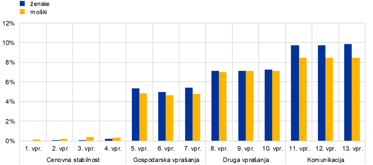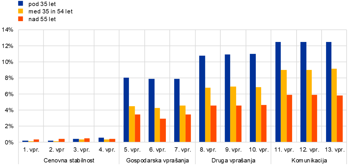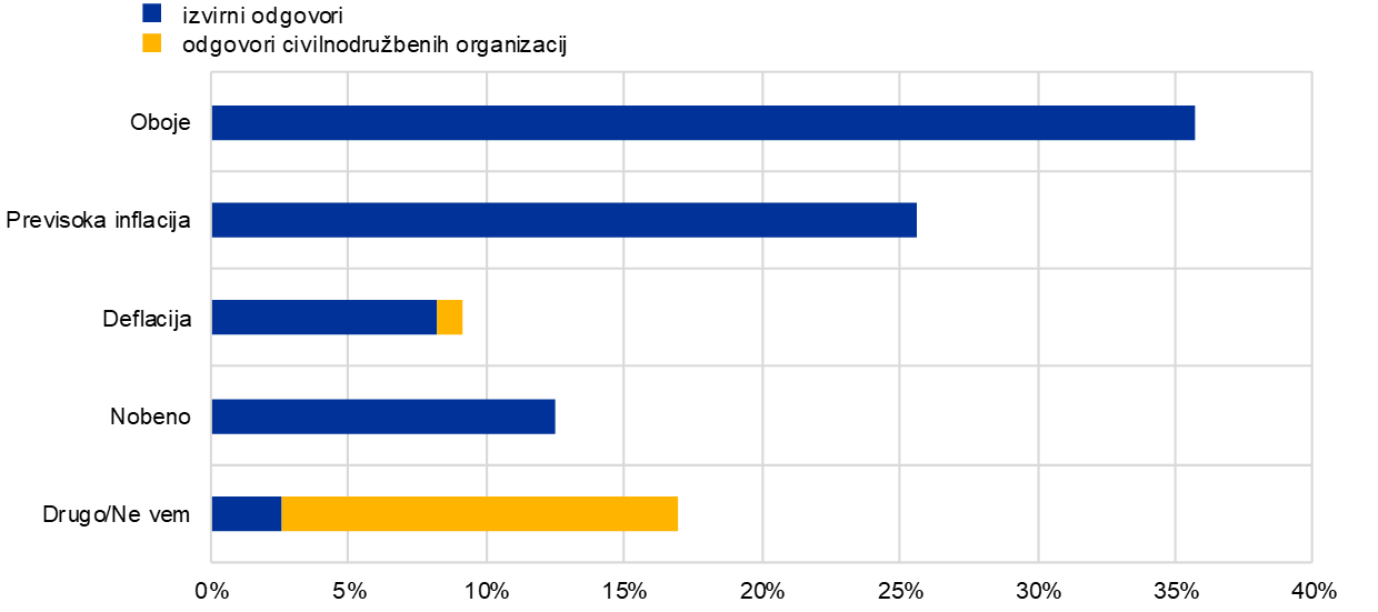 - Na vprašanje o čezmerni inflaciji in/ali deflaciji je največji delež anketirancev odgovoril, da jih skrbi oboje in da je pomembna stabilnost cen. Drugi največji delež anketirancev je navedel, da jih skrbi samo inflacija.