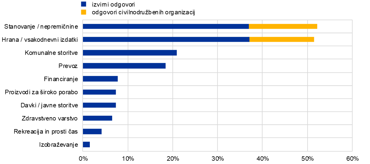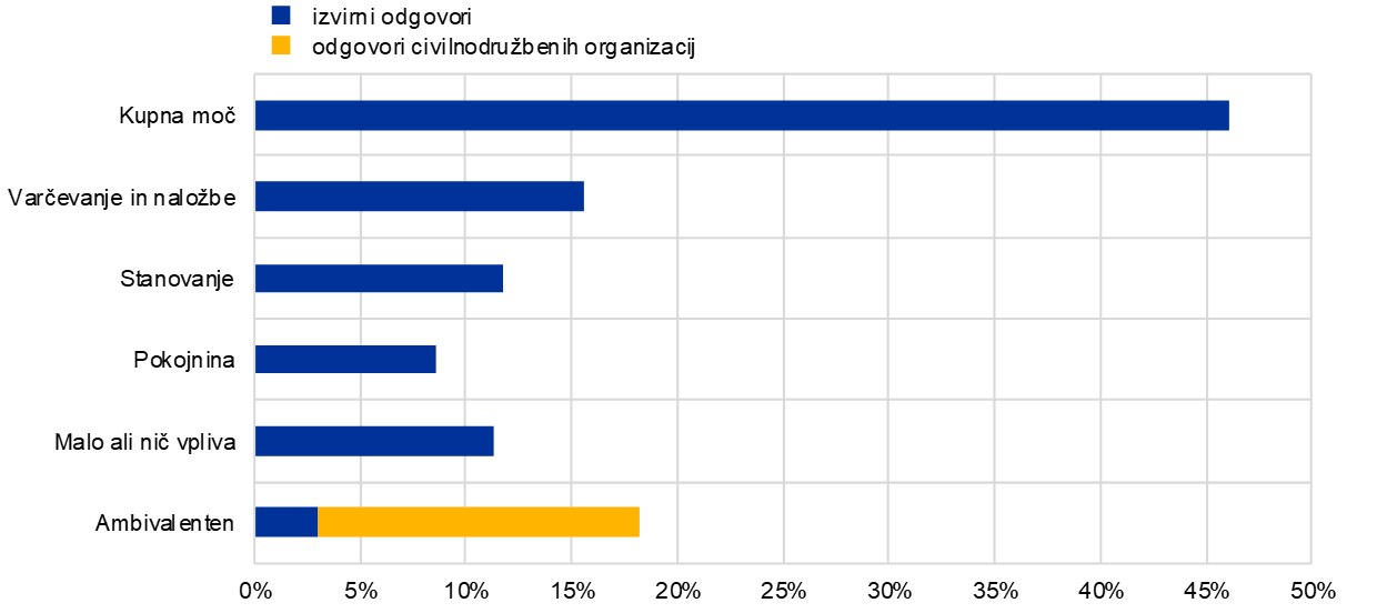 - Večina anketirancev je omenila vpliv naraščanja cen hrane in vsakodnevnih izdatkov. To je bilo zlasti zaskrbljujoče za ženske in za anketirance iz južnih držav članic EU. 50% prispevkov je omenjalo stanovanjske stroške, ena petina pa stroške komunalnih storitev in prevoza.