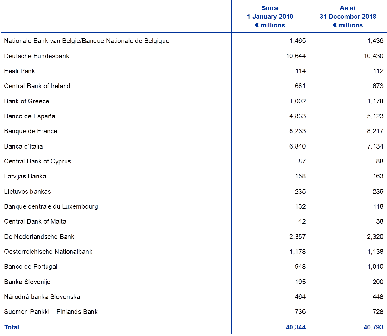 The ECB kept its subscribed capital unchanged at €10,825 million after the Bank of England’s withdrawal from the ESCB. The share of the Bank of England in the ECB’s subscribed capital, which stood at 14.3%, was reallocated among both euro area and remaining non-euro area NCBs.
