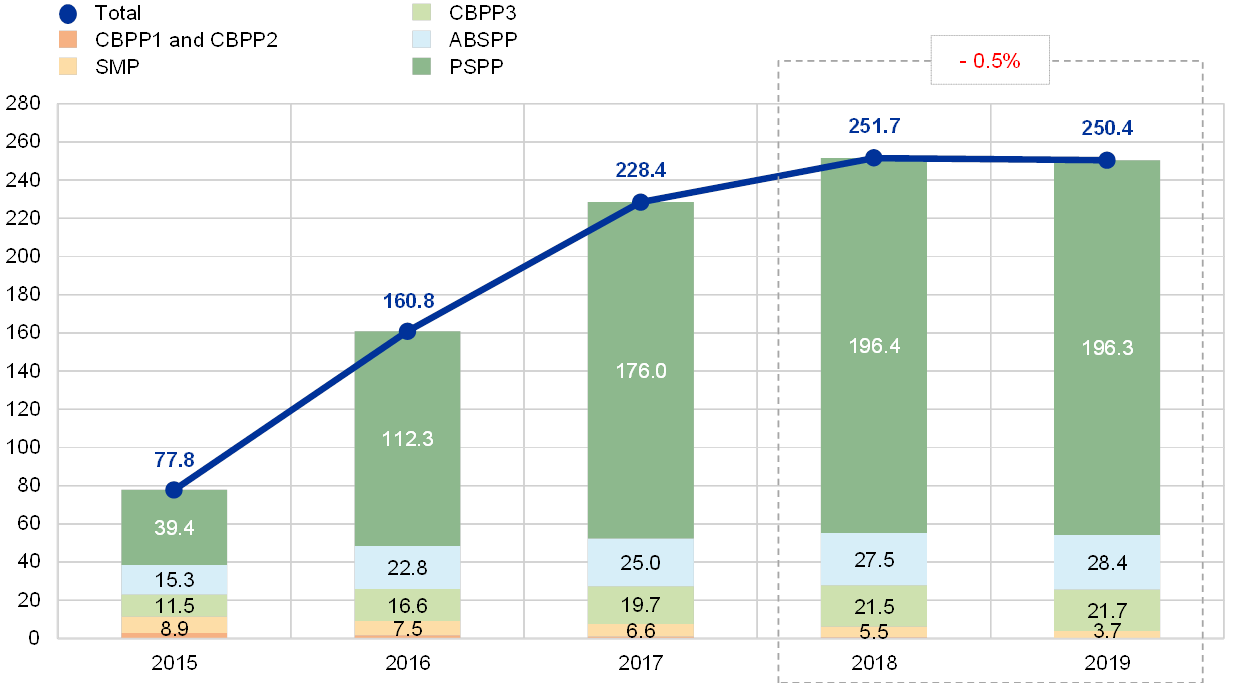As at the end of 2019 the portfolio of securities held by the ECB for monetary policy purposes decreased by €1.3 billion to €250.4 billion (see Chart 2), mainly owing to redemptions of securities held under the SMP, CBPP1 and CBPP2. The total decrease in these holdings amounted to €2.2 billion. The €0.1 billion decrease in the PSPP portfolio was mainly due to the net impact of the amortisation of premiums and discounts[7] on securities held in the portfolio, which more than offset the net purchases conducted in the last two months of 2019.